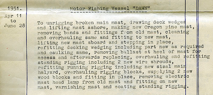 Whilst off North Foreland, the spare sail was set to steady the vessel whilst fishing. The “DAWN” carried on fishing until midnight on the 5th. April, when the main mast broke and hung in the rigging. The vessel returned to Ramsgate Harbour, under power, arriving 5.15 a.m., 6th. April, 1951.