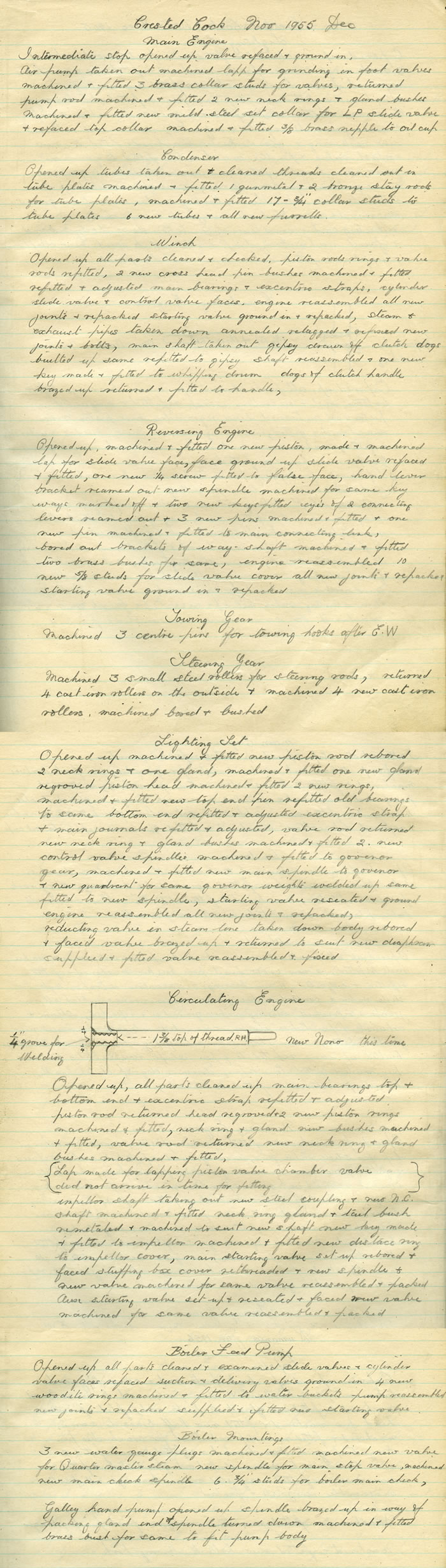 L 96'. B 25.1'. D 11.8'. 177grt. 1000ihp. 3cylTE 16"x25"x42"x 27" stroke 200psi steam engine by builder.