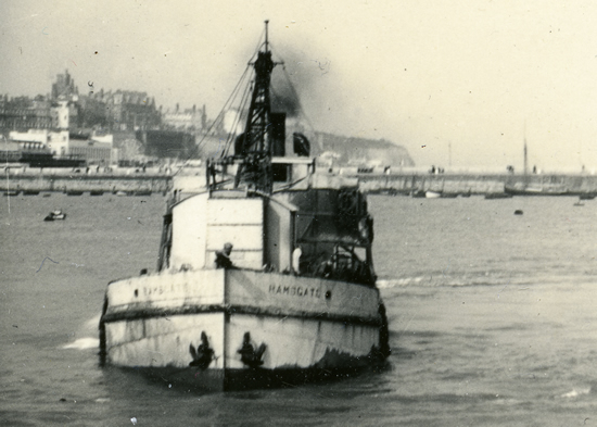 “Ramsgate” was used in the early part of the war to lay mines in the approach to the harbour. Firstly she laid small charges in the seabed and after these were detonated, she further excavated the area for the mines which were primed onboard before being lowered into position by her crane. After war, she then had the equally dangerous job of removing them.